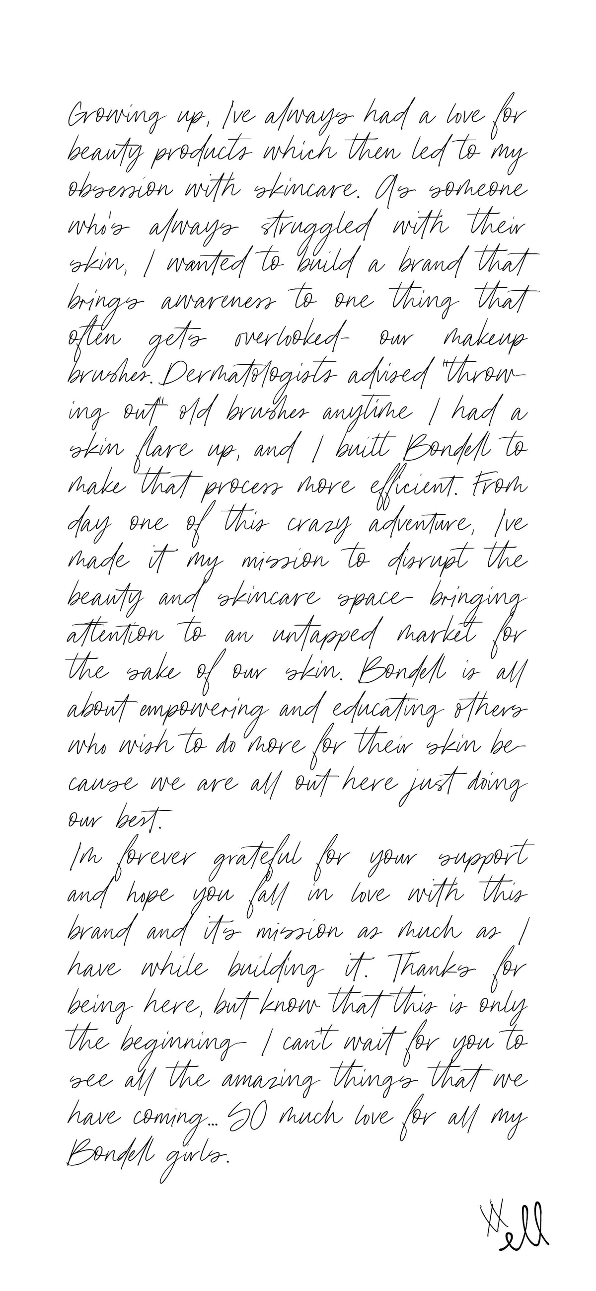 A long time dream of an idea, built into a business - Bondell makes high quality, clean makeup brushes a convenient and elevated experience. While dealing with stubborn skin issues and being a clean freak, Ellie came up with a unique solution to boost her skincare routine: changing out her makeup brushes. After time and time again of cleaning her brushes, she realized that they never returned to their original, luxurious quality that we pay for. Therefore not only sacrificing the brushes application, but never feeling free of old bacteria. We all know, but tend to look away from the fact that our makeup brushes are harvesting bacteria. Washing your makeup brushes, although a common practice, may not be completely eliminating all of the bacteria and gunk lurking within the bristles. While washing them can effectively remove the surface dirt, oil, and color residue from product, deeper layers of bacteria may still remain even after thorough cleaning. This is where the solution of letting Bondell replace your brush set comes into play. Bondell is a makeup brush subscription service built off of passion for skincare, hygiene and beauty convenience. Members receive the entire product line which includes a variety of fool-proof brushes that make your glam seamless. Don't let dirty brushes compromise the health and beauty of your skin.